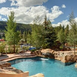The property hosts an expansive outdoor swimming complex with year-round outdoor pool, waterslide and hot tub. Inside guests will find a children’s playroom, fitness center, steam room, video room and heated underground parking.